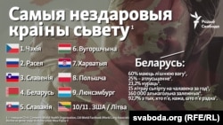 Як адзначаецца ў дасьледаваньні, Усходняя Эўропа стала самым нездаровым рэгіёнам у сьвеце. Беларусь у рэйтынгу «Топ самых нездаровых краінаў» займае чацьвёртае месца пасьля Чэхіі, Расеі (другое месца) і Славеніі (трэцяе месца), далей у першай дзясятцы ідуць Славакія, Вэнгрыя, Харватыя, Польшча, Люксэмбург і Літва разам з ЗША, якія падзялілі 10-е месца топу.