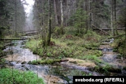 У гумовых ботах хлюпае вада. Ногі засмоктвае глей. З дна б’юць крыніцы. Часам даводзіцца пералазіць праз ссохлыя дрэвы. Шлях па вадзе перакрывае таўшчэзная заімшэлая яліна. Паабапал ручая высяцца хвоі. Хмызьнякі нагадваюць джунглі. На сьцежках відаць сьвежыя глыбокія сьляды — пэўна, ваўка. Гэтыя дзікія мясьціны рэдка бачаць чалавека.