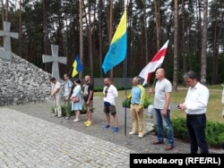 Прадстаўнік адміністрацыі запаведніка «Быкаўнянскія магілы» распавяла ўдзельнікам беларускай акцыі аб гісторыі стварэньня мэмарыялу.
