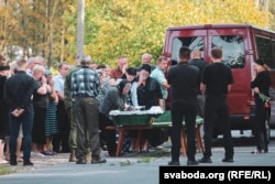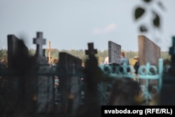 Невядомыя хлопцы ў спартовых гарнітурах не давалі журналістам наблізіцца да пахаваньня.
