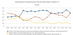 З іншага боку, параўнаньне графікаў 2 і 4 паказвае, што пазначэньне больш шчыльнай расейскай альтэрнатывы істотна зьніжала колькасьць прыхільнікаў расейскага вэктару і павялічвала колькасьць прыхільнікаў эўраінтэграцыі.