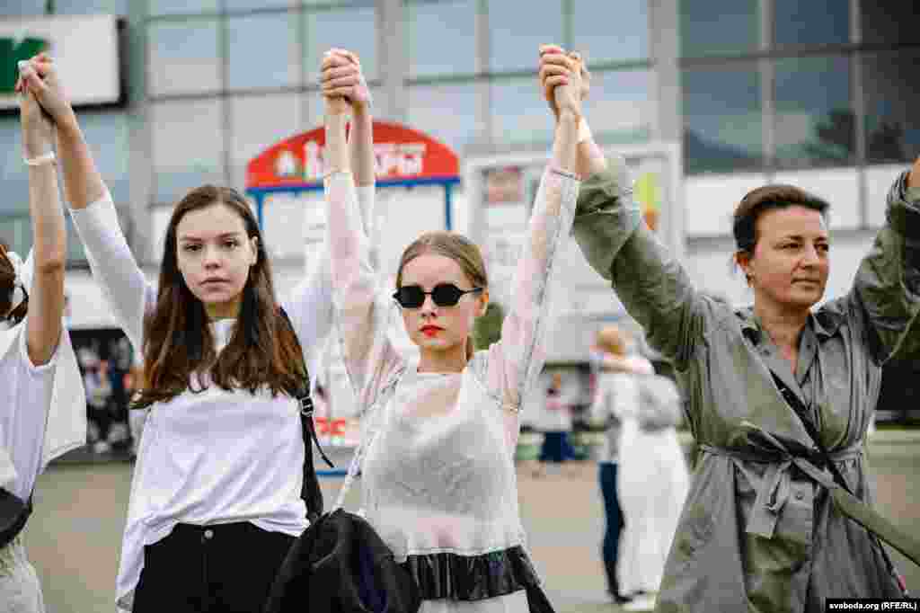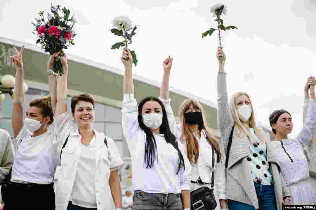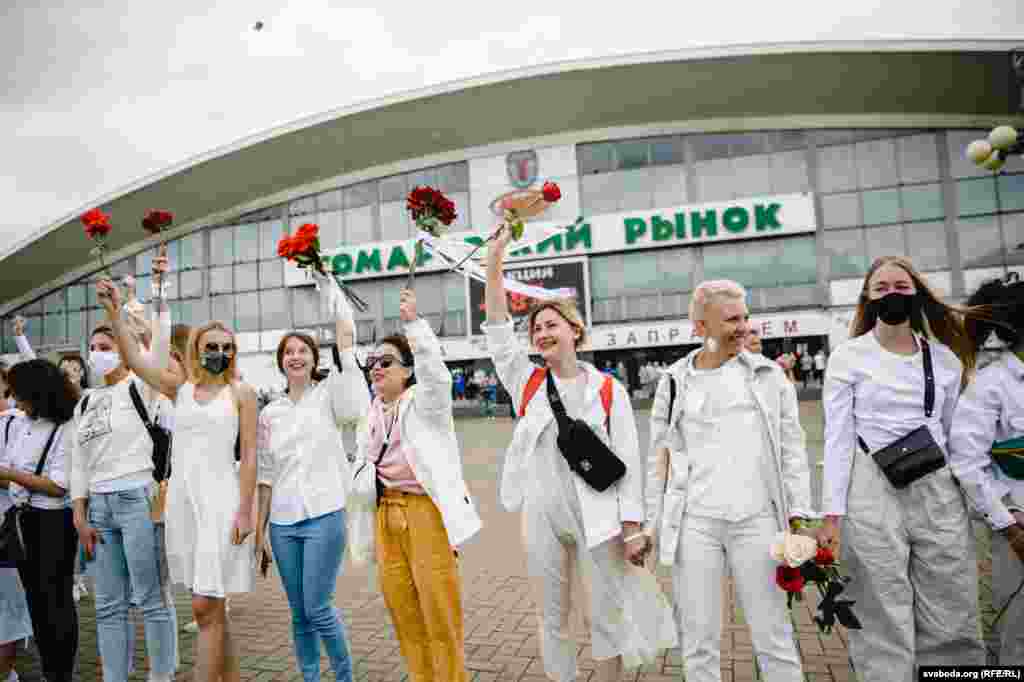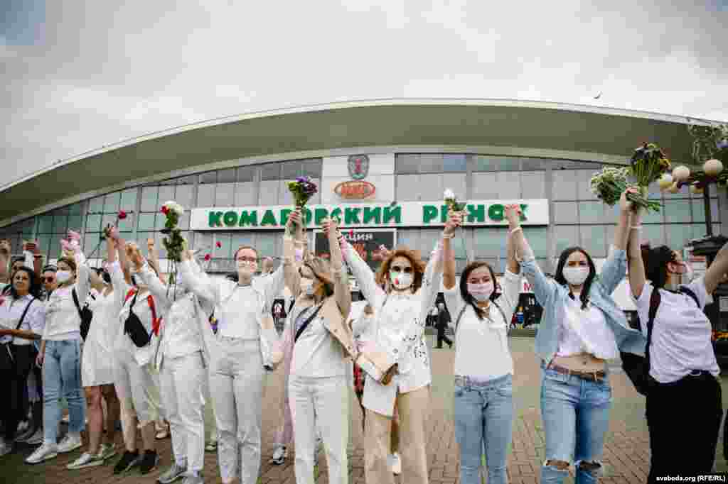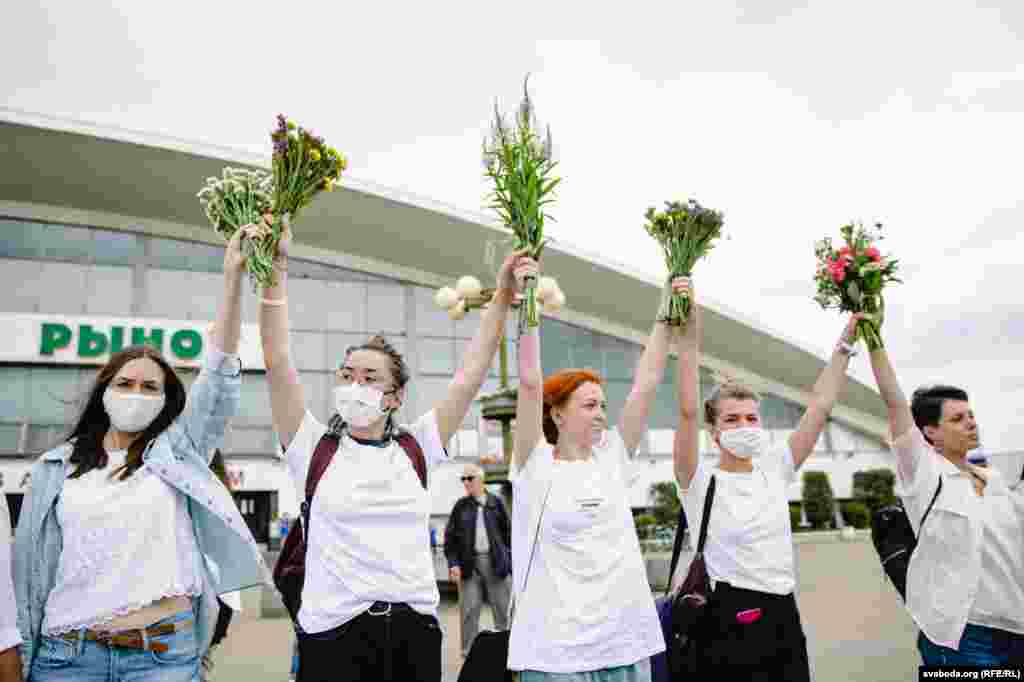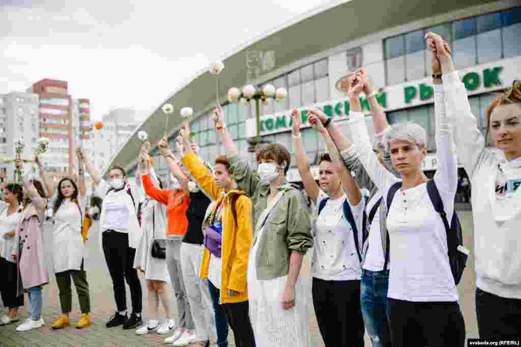 Каля Камароўскага рынку ў Менску некалькі соцень дзяўчат сталі з кветкамі ў доўгі ланцуг. Гэта акцыя салідарнасці з тымі, хто ў гэтыя дні пакутуе ад гвалту.