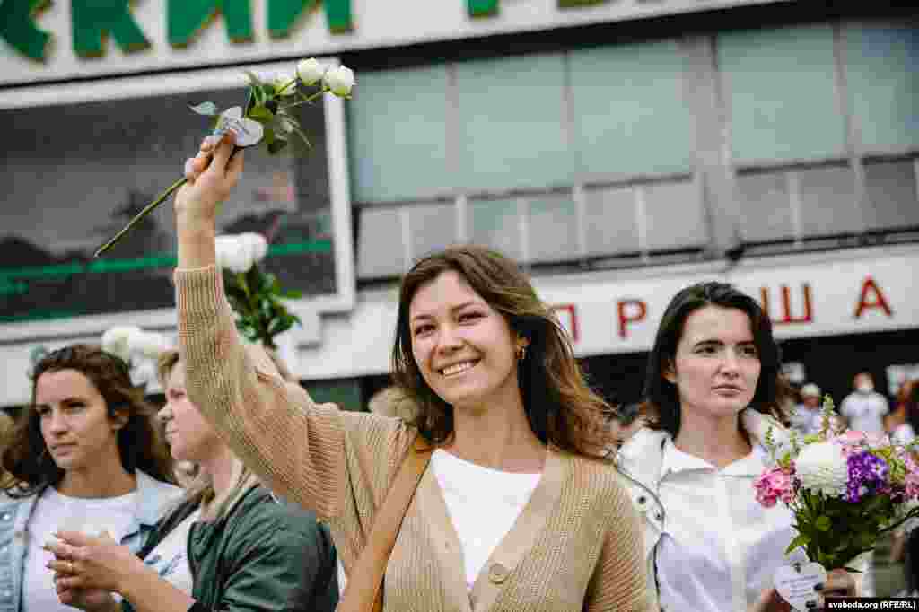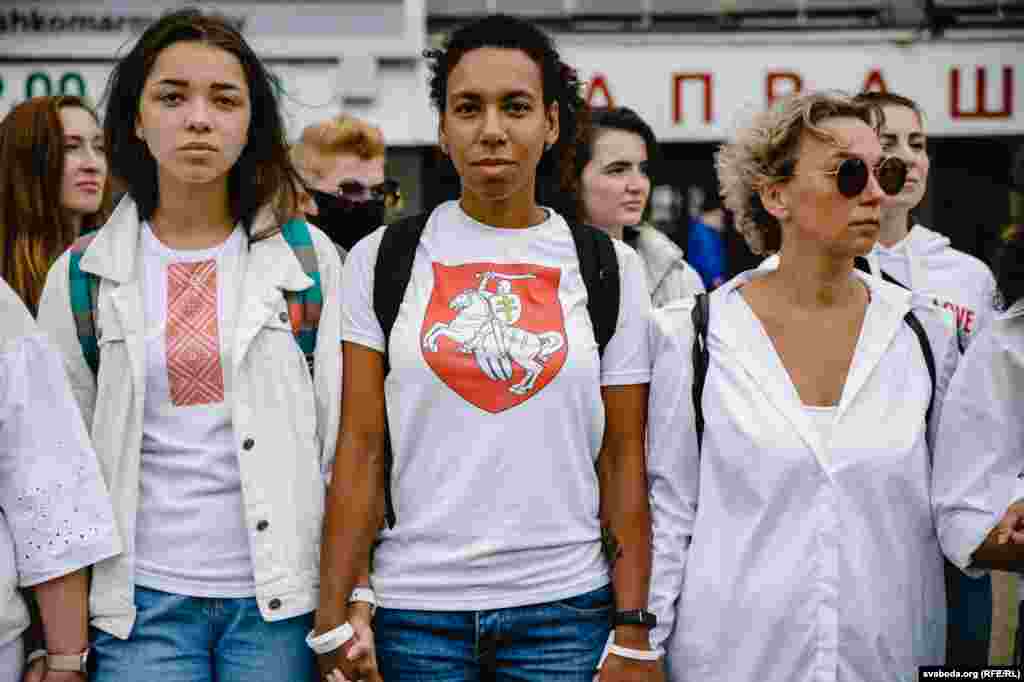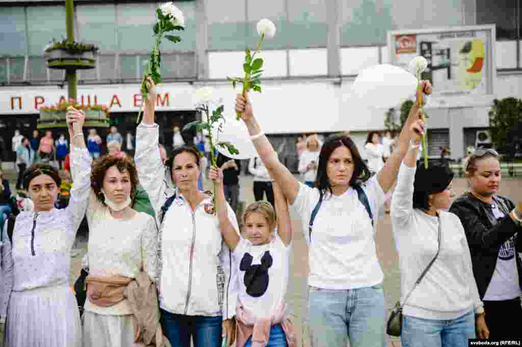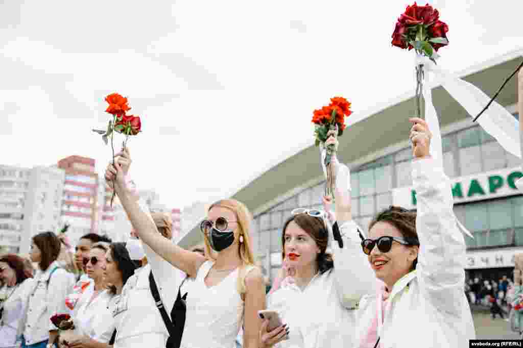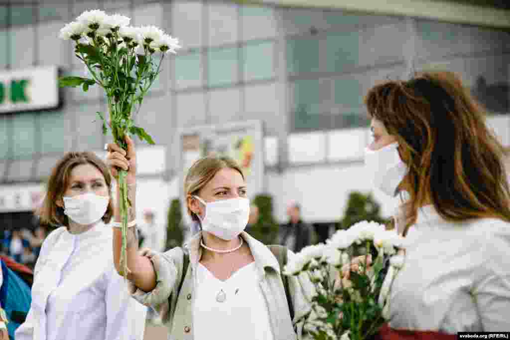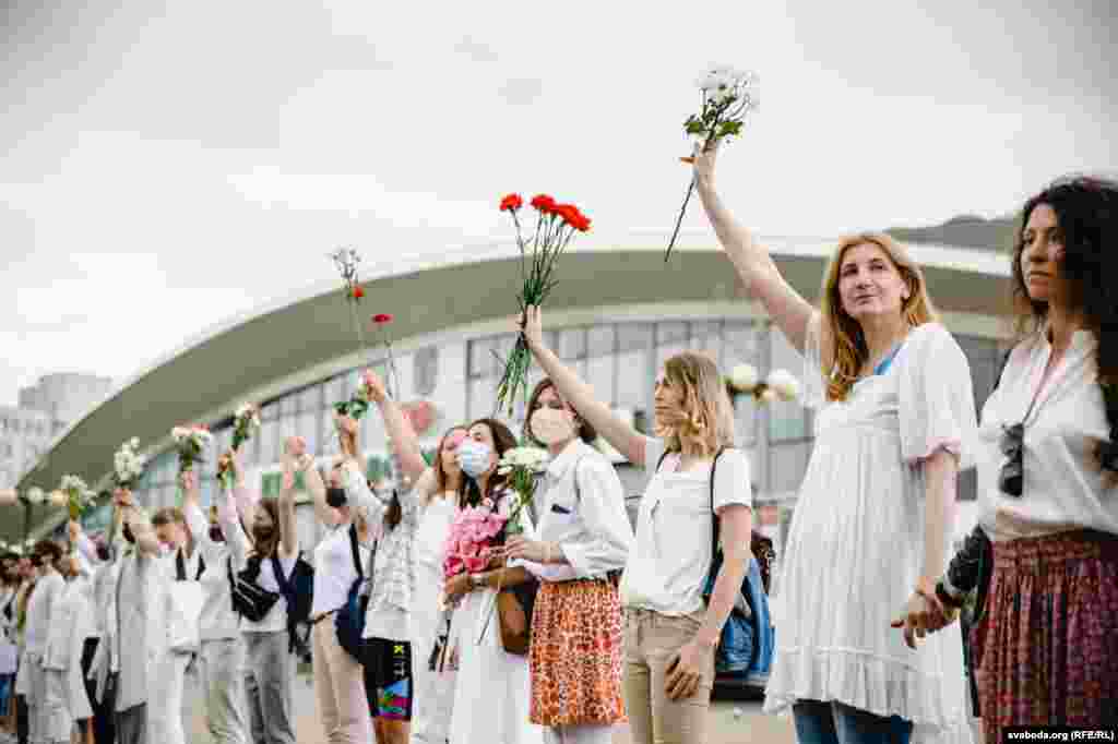 Каля Камароўскага рынку ў Менску некалькі соцень дзяўчат сталі з кветкамі ў доўгі ланцуг. Гэта акцыя салідарнасці з тымі, хто ў гэтыя дні пакутуе ад гвалту.