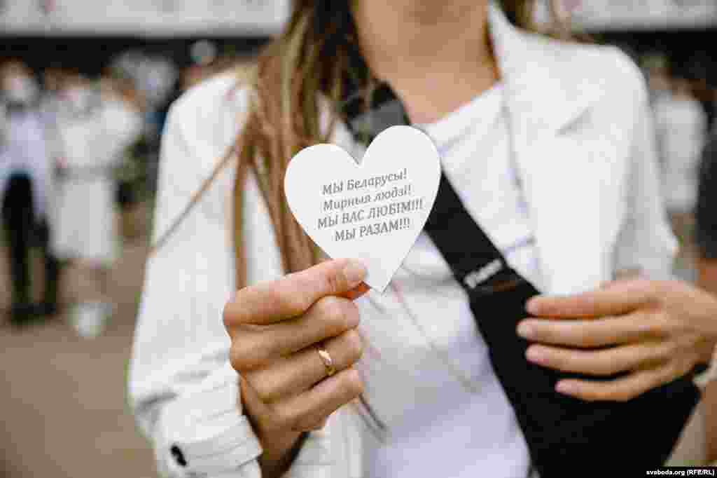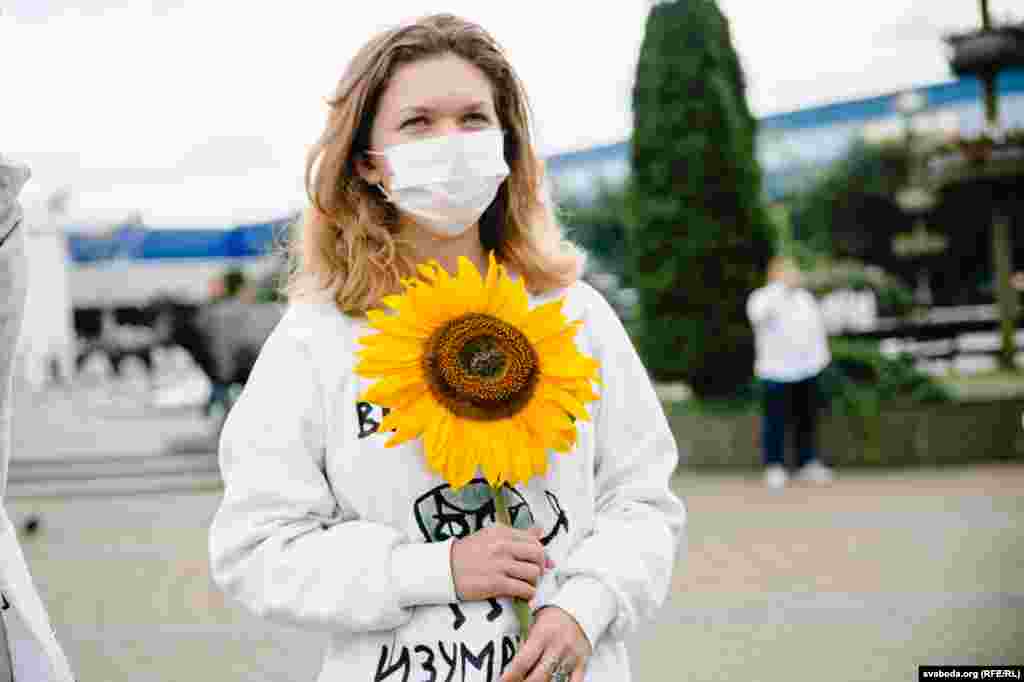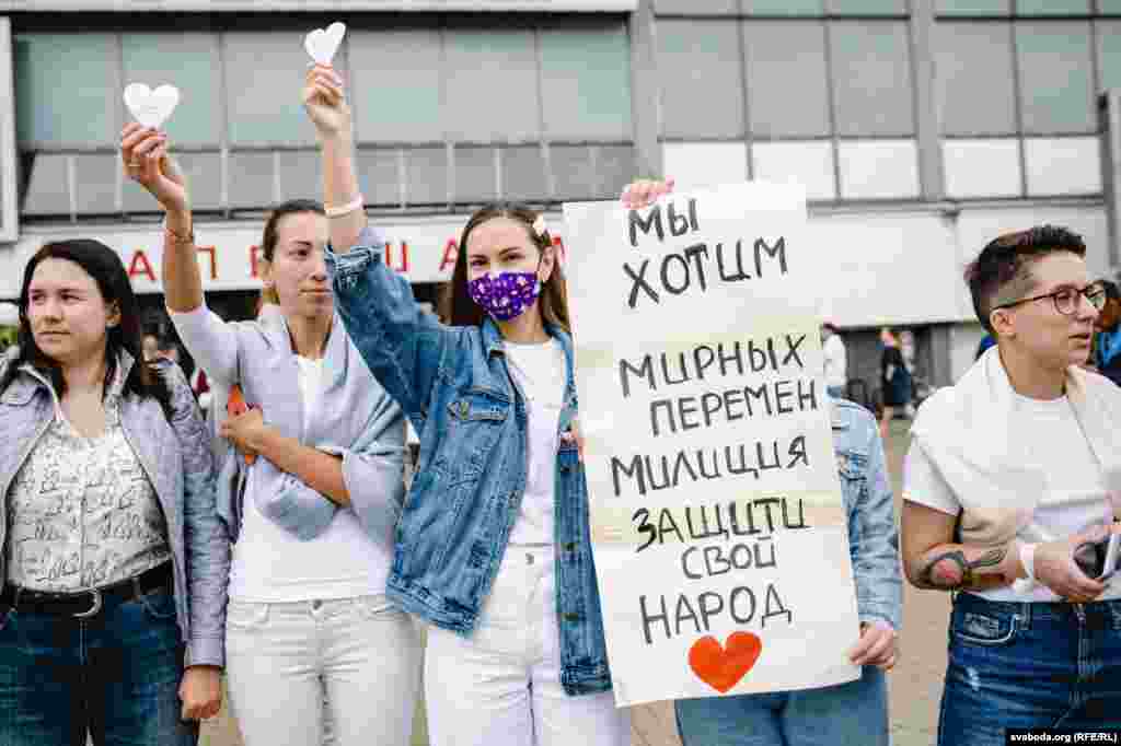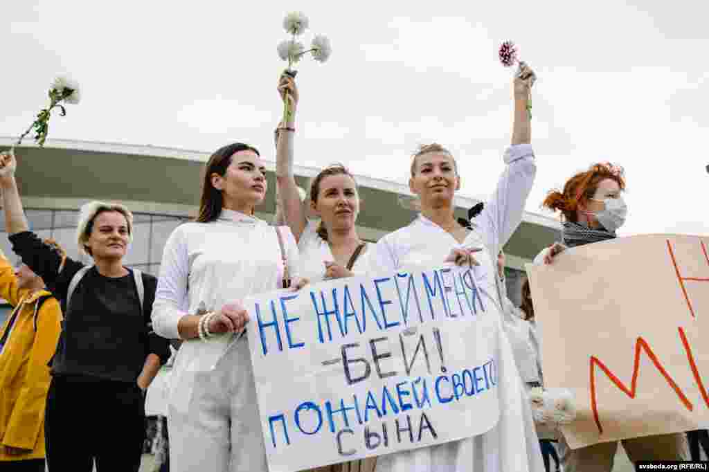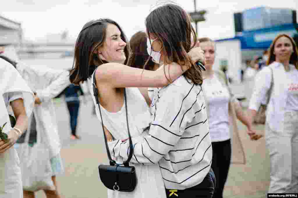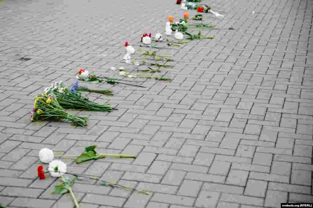 Каля Камароўскага рынку ў Менску некалькі соцень дзяўчат сталі з кветкамі ў доўгі ланцуг. Гэта акцыя салідарнасці з тымі, хто ў гэтыя дні пакутуе ад гвалту.