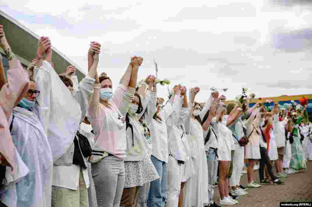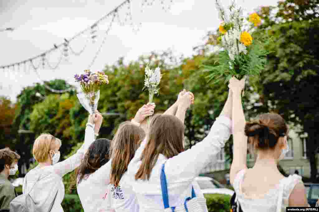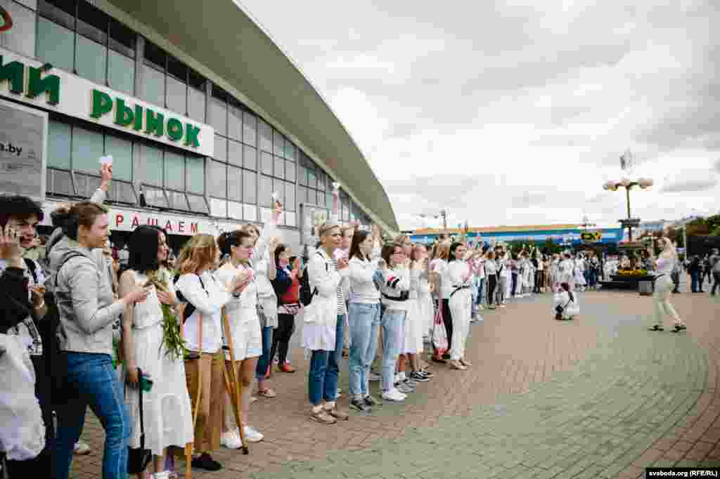 Каля Камароўскага рынку ў Менску некалькі соцень дзяўчат сталі з кветкамі ў доўгі ланцуг.