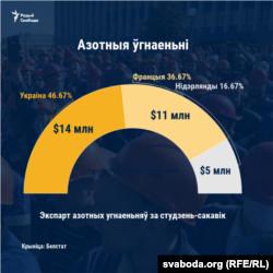 Трэці стратэгічны экспартны тавар — азотныя ўгнаеньні. За студзень-сакавік Беларусь экспартавала гэтага тавару на 37,3 мільёна даляраў. Найбольш ва Ўкраіну(на $14 млн), Францыю(на $11 млн) і Нідэрлянды (на $5 млн).