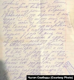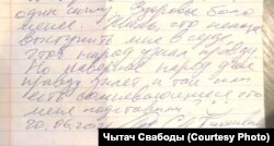 «Правільна, што верыш у мой фарт. Ну каму яшчэ так пашанцуе, каб зь Менску ў родны Гомель на суд адправілі? Альбо каб у кайданках не вазілі два разы на дзень на суд і ў „стаканах“ у судзе не стаялі? Мне суд проста ў СІЗА перанесьлі! Выйшаў з камэры а 10:00, а не а 6:00 — і адразу на паседжаньне. І на абед да сябе ў камэру. Крута ж! Шкада, што закрыты суд зрабілі. Але гэта таму, што няма чаго народу паказаць. А так бы адкрылі — і БТ дзяжурыла тут», — піша палітвязень у лісьце, датаваным 20 чэрвеня.