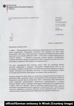 Ліст падпісаў кіраўнік аддзелу прэсы ад імя амбасады Нямеччыны ў Менску Крысьціян Зіпман.