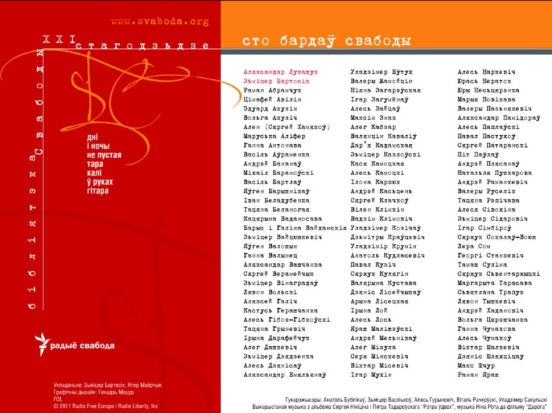 31 сакавіка ў малой канцэртнай залі «Менск» прайшоў канцэрт вядомых беларускіх бардаў: Сержука Сокалава-Воюша, Зьмітра Бартосіка і Андрэя Плясанава. На канцэрце адбылася прэзэнтацыя мультымэдыйнага DVD-дыска «100 бардаў Свабоды», які выйшаў у сэрыі «Бібліятэка Свабоды».