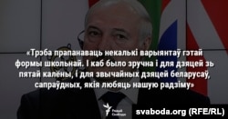«Я хацеў бы, каб гэтыя прадметы [гісторыя ў школе] вывучаліся на беларускай мове. Мы больш маем зносіны, у тым ліку ў побыце, на рускай мове. Беларускай мовы ў нашым побыце не хапае. Дрэнна гэта ці добра? Ня ведаю. Ня думаю, што гэта катастрофа».