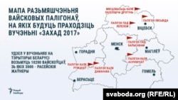 Сумесныя расейска-беларускія вучэньні «Захад-2017» пачнуцца 14 верасьня і працягнуцца тыдзень. Будзе задзейнічаны шэраг вайсковых палігонаў на тэрыторыі Беларусі — пад Лепелем, Барысавам, Віцебскам, Асіповічамі, Ружанамі і Даманавам. Таксама паведамляецца, што заплянаваныя рэйды каля Дрэтуні.